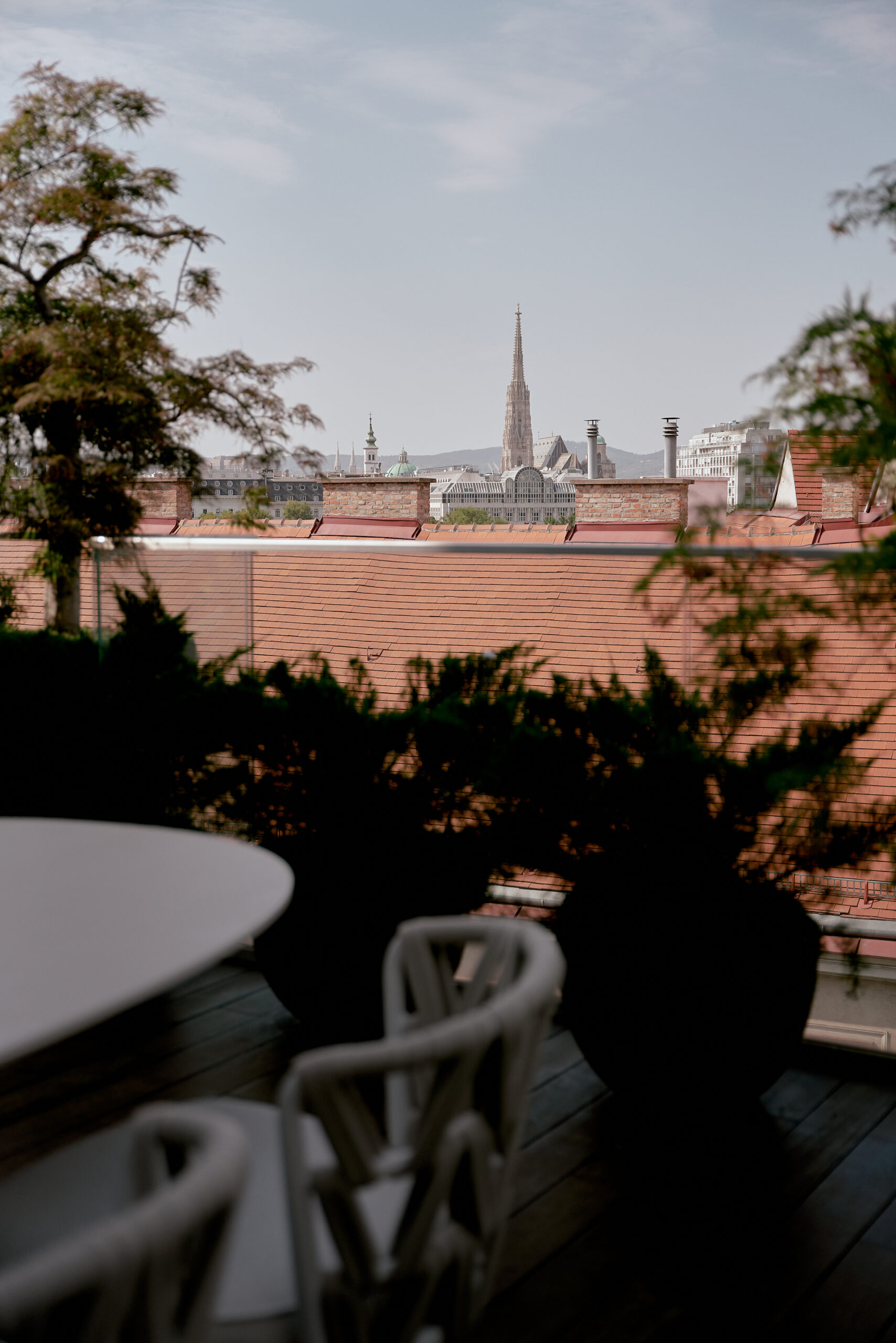 Nur wenige Wienerinnen und Wiener kommen tagein tagaus in den Genuss, ihre Heimatstadt aus der Vogelperspektive betrachten zu dürfen. Die unlängst von Mezza—Maiso gestaltete Penthouse-Wohnung setzt den Ausblick über die Dächer des 3. Wiener Bezirks gekonnt in Szene – und rückt die markante Silhouette des Nordturms der Domkirche St. Stephan gezielt in den Fokus.