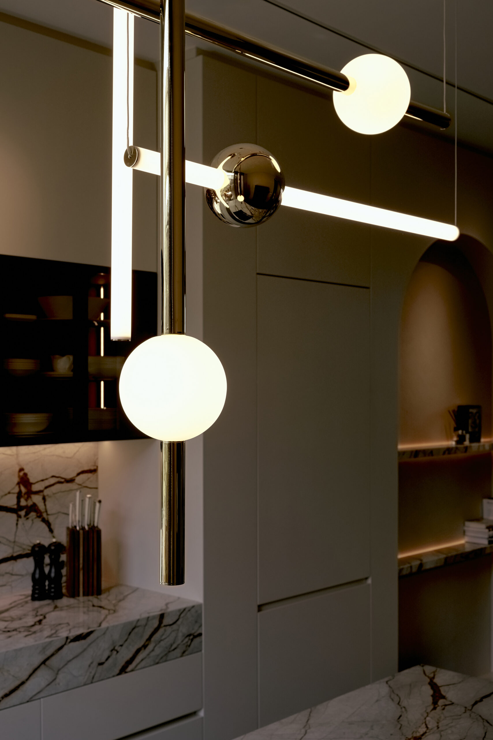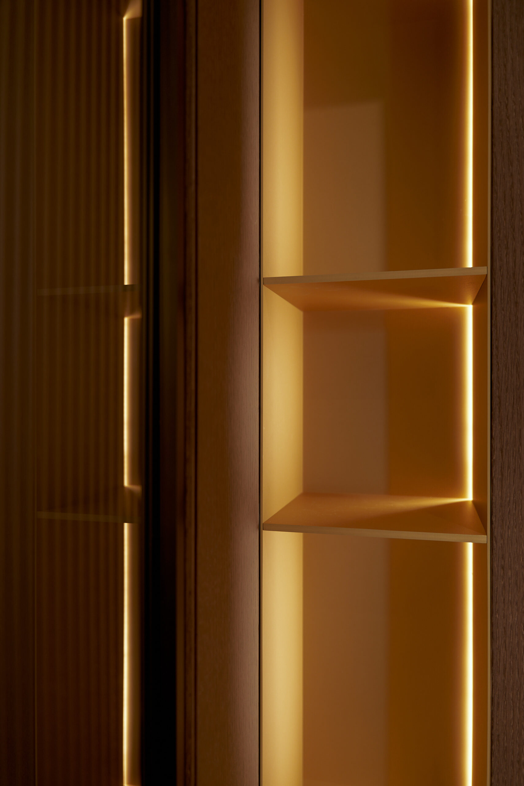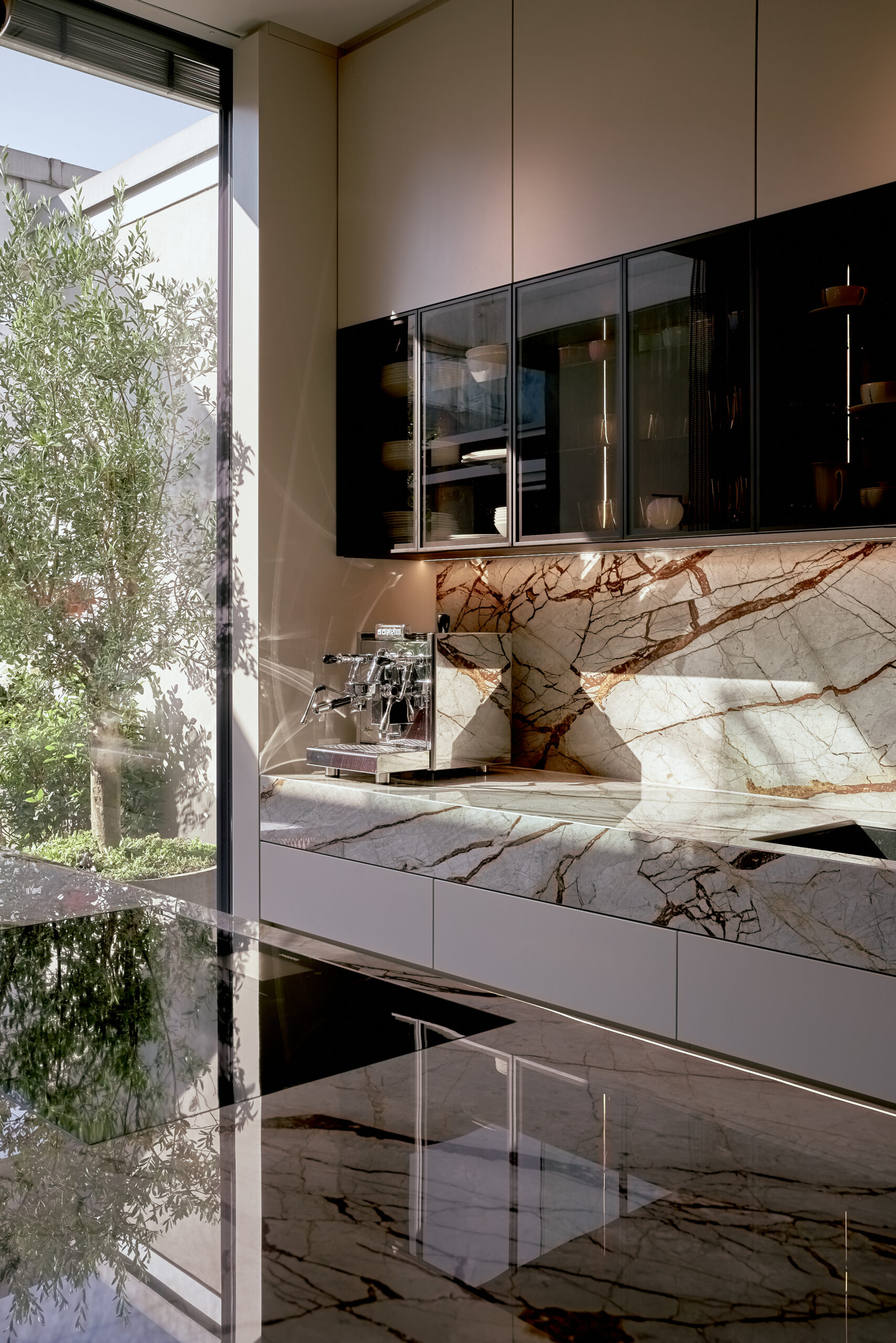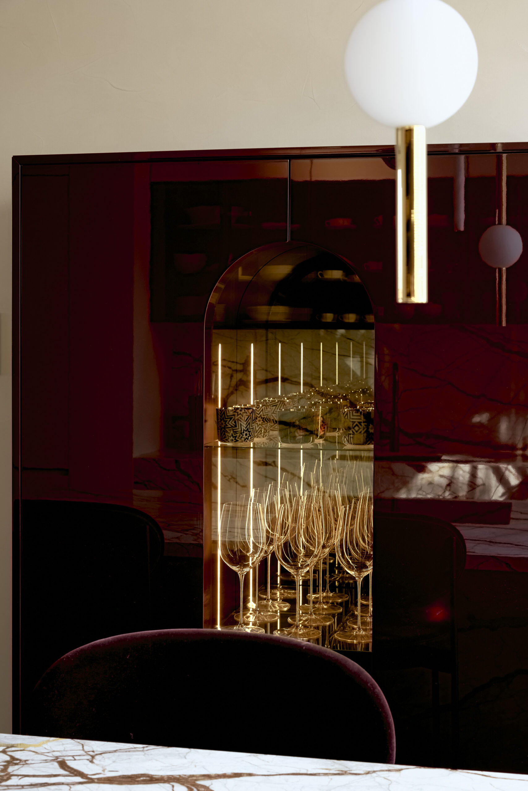 So wie es sich bei fast allen Ausstattungselementen um individuelle Maßanfertigungen handelt, wurde auch die Küche exklusiv für die Wohnung entworfen. Die Arbeitsfläche aus dem rotmelierten Keramik Werkstoff „Gold River von Fondovalle“ macht den Einbau mehr zum Kunstobjekt als praktischen Möbel. Die restlichen Oberflächen wurden entsprechend zurückhaltend gestaltet, der Oberschrank mit Glastüren setzt das ebenso von Mezza—Maiso ausgewählte Geschirr dezent in Szene.