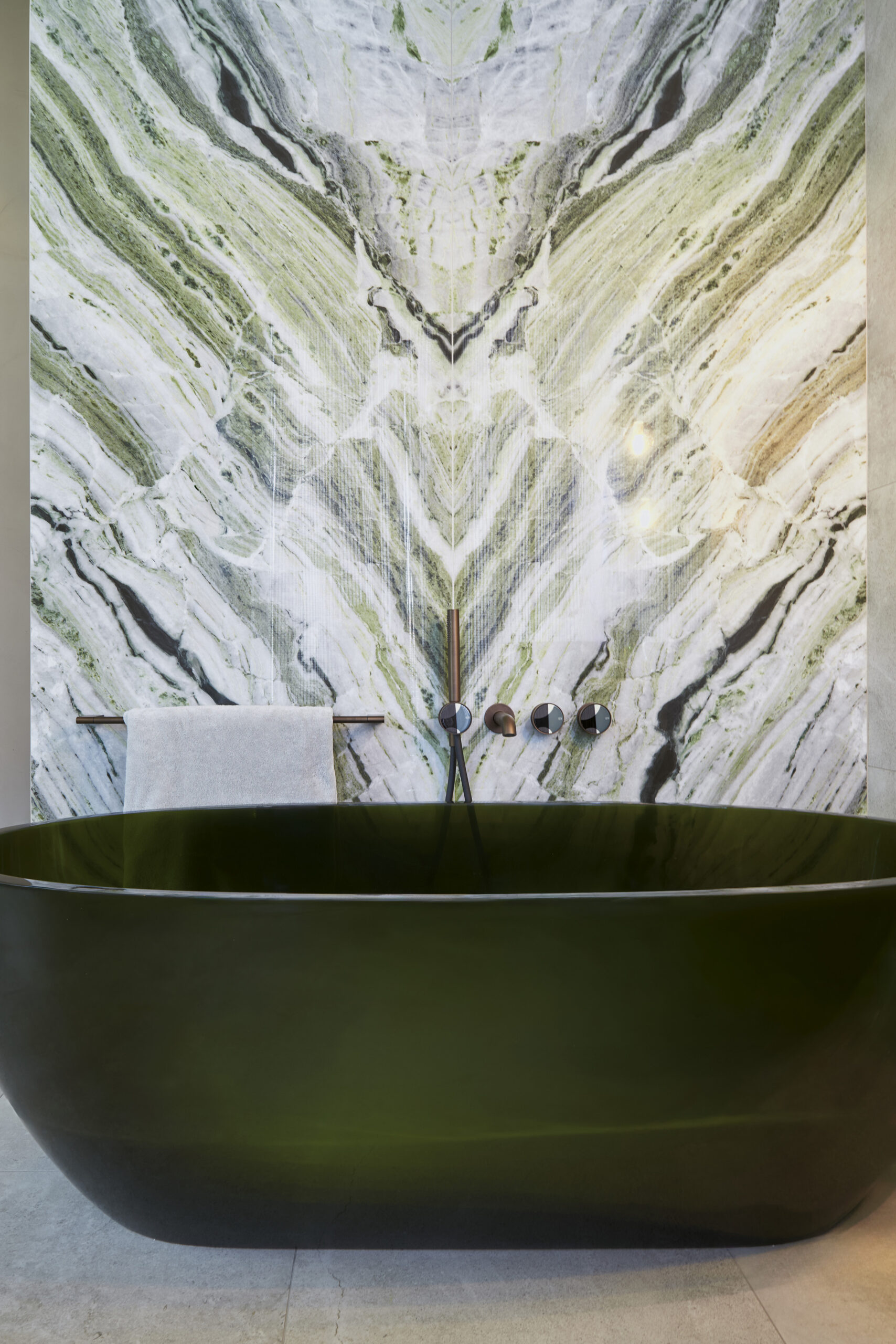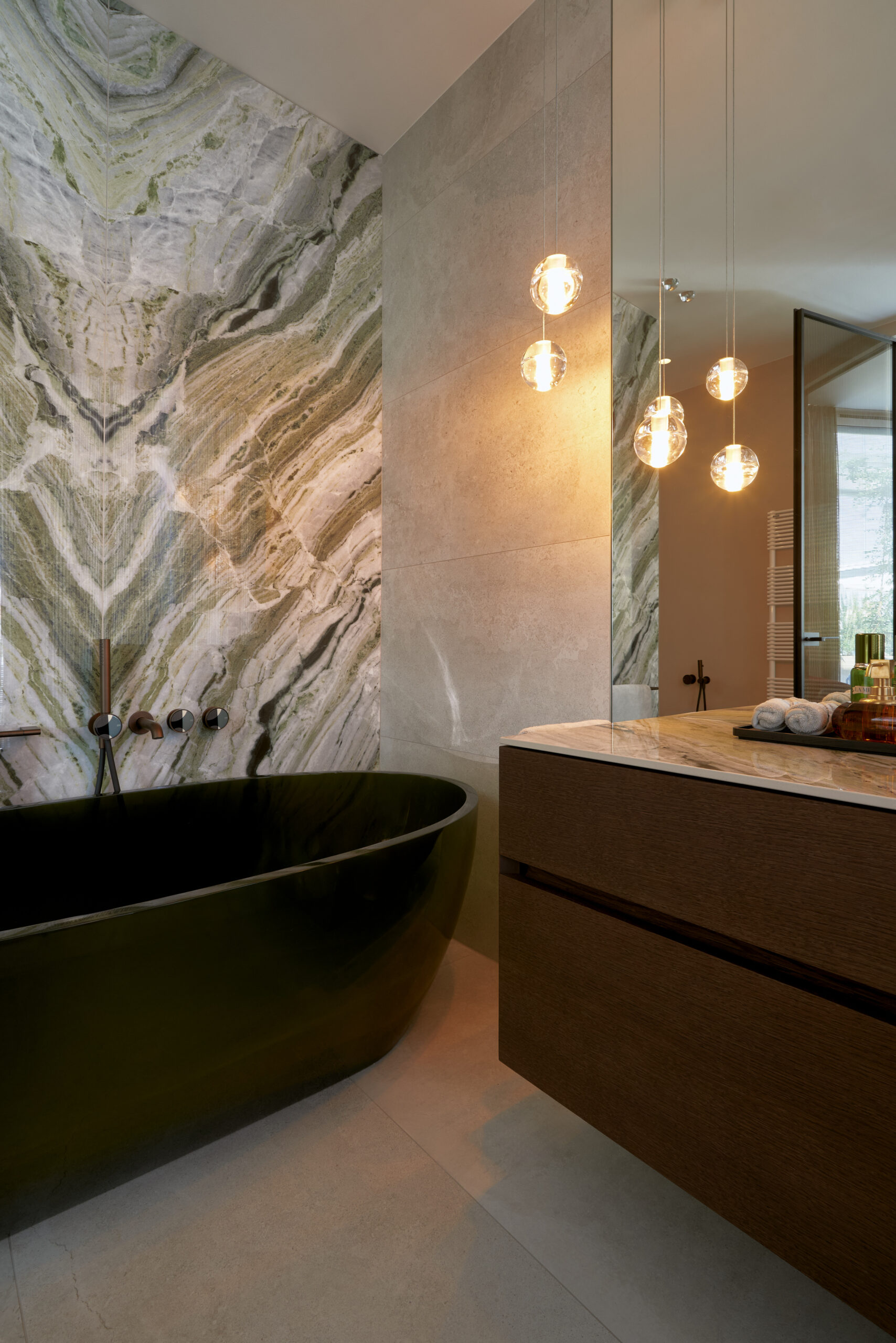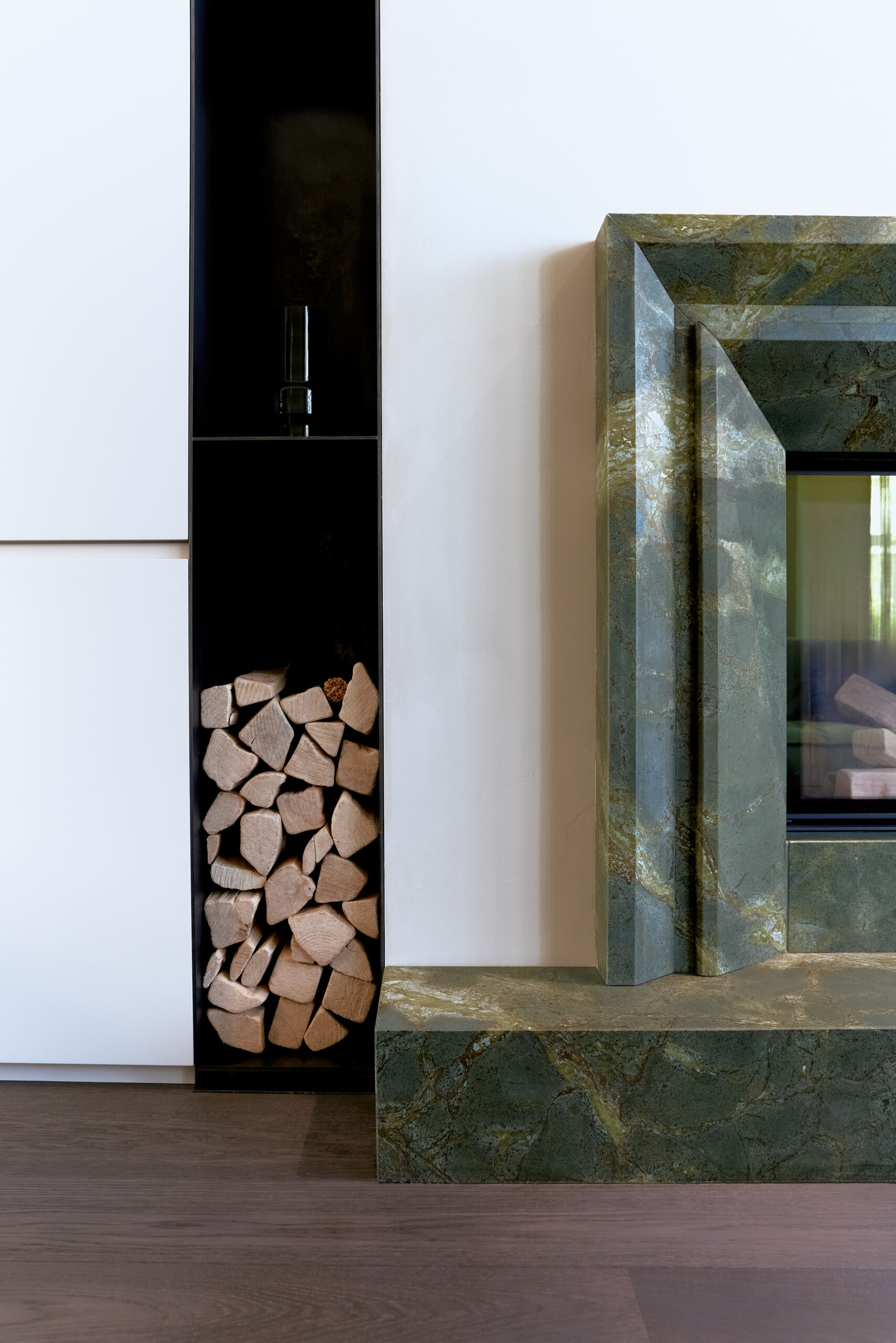 Die modebewusste Bauherrschaft wünschte sich keine cleane, minimalistische Designsprache, sondern einen Balanceakt aus kosmopolitischem Design mit opulenten Elementen. Besondere Highlights sind die vor einer Wand aus grün schimmernden Marmor-Fliesen der Serie „River Jade von Fondovalle“ freistehende Badewanne „Reflex von Antonio Lupi“, der Kamin aus dem Granitstein „Verde Borgogne“ sowie die weinrote Anrichte „Globe Trotter – Wonder“ in der Küche – übrigens ein Entwurf von „Marcel Wanders für Roche Bobois“.