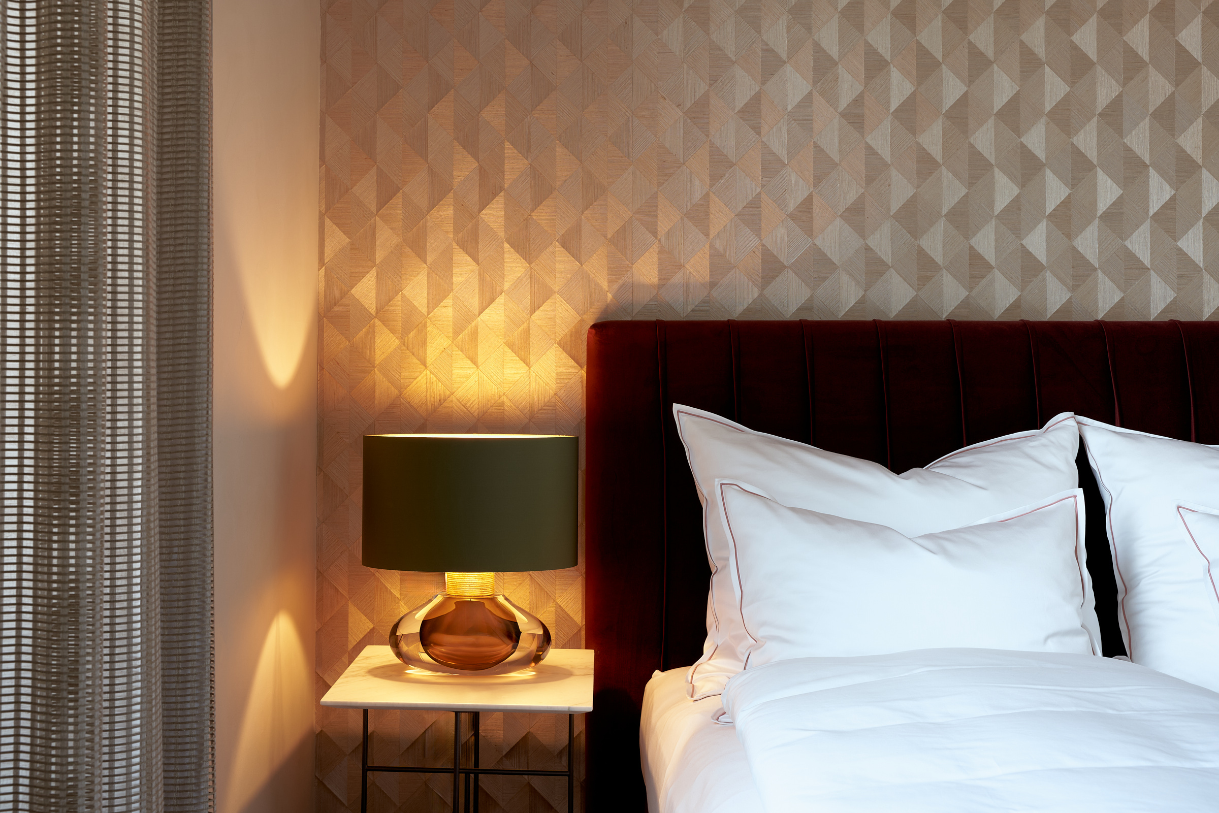 Wenn die warme Morgensonne in das Schlafzimmer der 165 qm großen Penthouse-Wohnung fällt, gewinnen farbige Akzente wie die Wandbekleidung aus Seegras von „Arte International“, das textilbezogene Betthaupt von „Schramm – home of sleep“ oder die „Coffee Bean Lamp von Porta Romana“ merklich an Strahlkraft. Starke Farbakzente finden sich aber nicht nur in der Wohnung wieder, sondern auch rundherum. Den Bauherren lag die Gestaltung der Außenflächen sehr am Herzen, was sich in den verschiedenen farbenfrohen Loungeinseln der italienischen Marke „Talenti“ und begrünten Bereichen auf den umgebenden Terrassen mit einer Fläche von fast 65 qm manifestiert.
