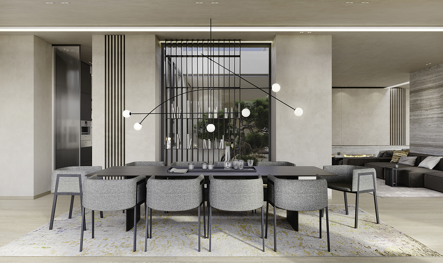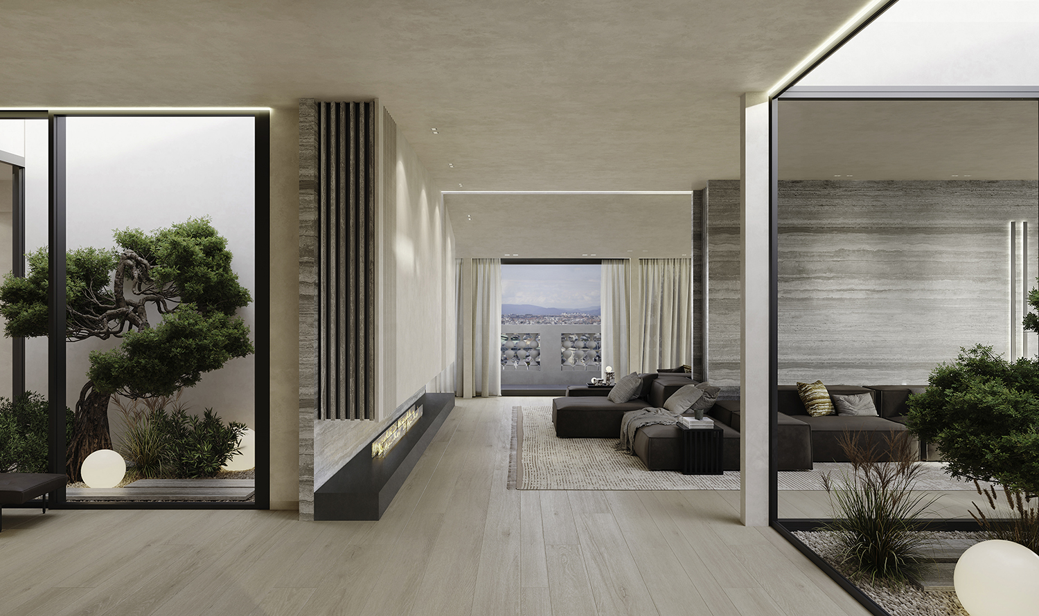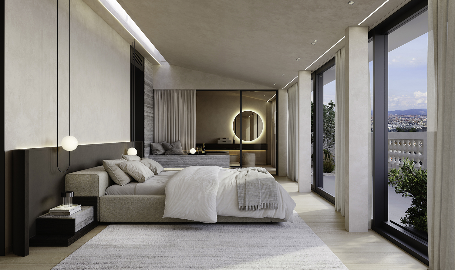 Im Mittelpunkt steht eine klare räumliche Dramaturgie: offene, kommunikative Bereiche treffen auf fein zonierte Rückzugsorte. Übergänge sind fließend, Blickachsen bewusst gesetzt, Proportionen präzise ausbalanciert. So entsteht ein Zuhause, das Weite zulässt, ohne Intimität zu verlieren — und dass sich im Alltag genauso stimmig anfühlt wie in besonderen Momenten. Materialität wird zur Haltung. Natürliche Oberflächen, warme Texturen und handwerkliche Details schaffen Ruhe und Tiefe. Nichts ist nur dekorativ gedacht, alles ist Teil eines durchgängigen Konzepts: reduzierte Eleganz, die nicht laut sein muss, um zu bleiben. Maßgefertigte Einbauten und kuratierte Stücke verbinden Lage, Architektur und Interieur zu einer einzigen Wohnlichkeit. Der Außenraum wird als selbstverständliche Erweiterung des Wohnens verstanden — als Ort für Stille, für die Bewohner gleichermaßen wie für die Gäste, und für einen einzigartigen Blick auf die Sehenswürdigkeiten Wiens, wie dem Burggarten mit angrenzender Hofburg oder dem Kunsthistorische Museum.